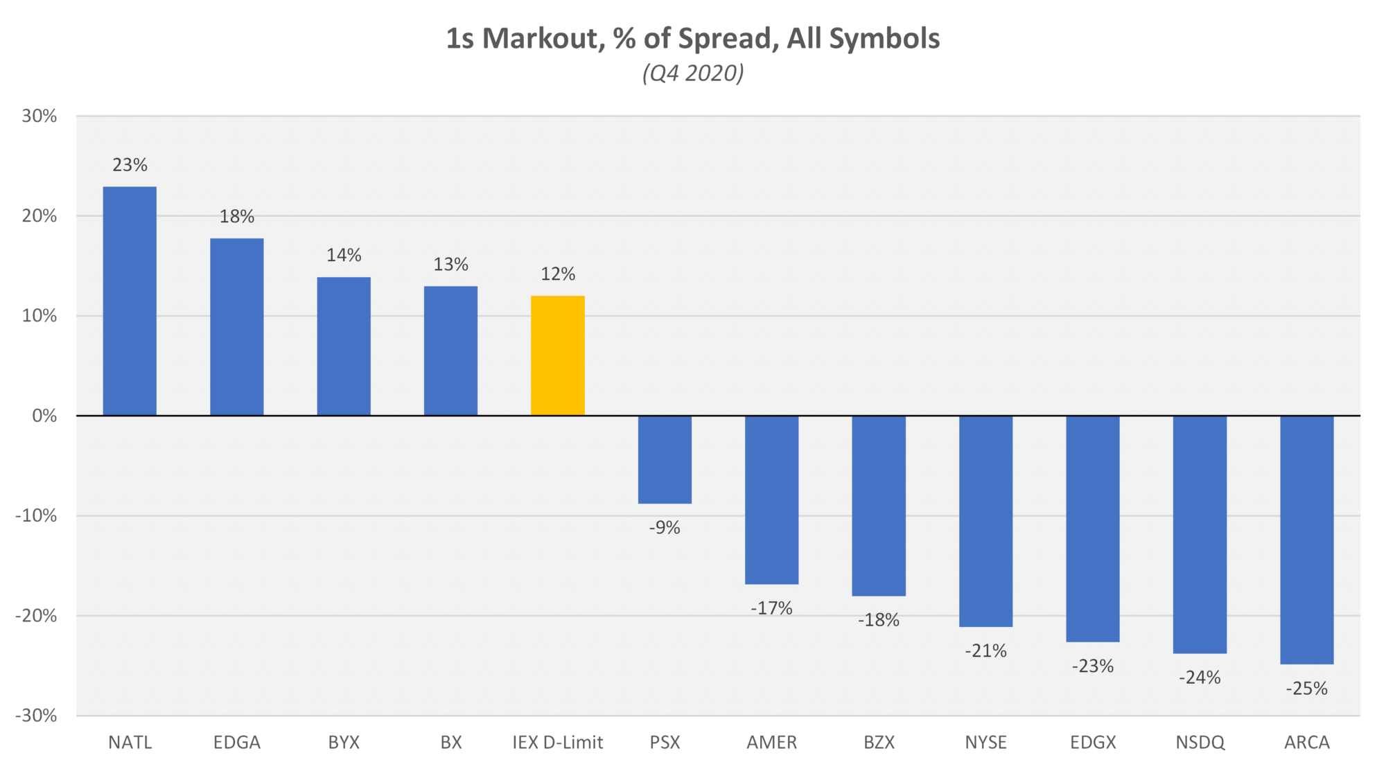 Just as it was important to control for the rates various exchanges charge for executions, it’s also important to control for the types of stocks each venue trades. For example, if a given venue skews towards wider-spread names, markouts expressed in mils per share might have larger magnitudes. To do this, we repeated the analysis in percent of spread.