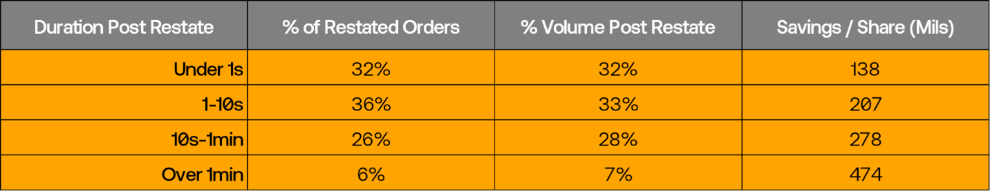 While nearly a third of restated orders rest less than a second after being restated (and receive 138 mils/share in savings on average!), waiting longer can mean far more PI. This is because by waiting longer, you have the chance to capture the savings from the D-Limit order being restated multiple times in a row. In fact, for the 6% of restated orders that rest more than a minute after a first restatement, the savings is 474 mils per share: that’s buying almost 5 cents below the bid or selling almost 5 cents above the offer!